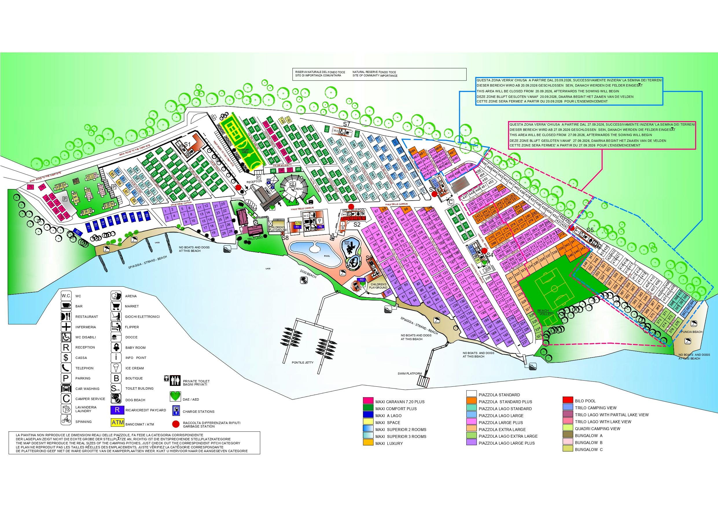 Toutes les prises TV avec réception numérique. Salle de spinning avec 30 vélos. Amphithéâtre couvert. Grand parc aquatique avec toboggans. Randonnées guidées, balades à vélo et sorties en bateau. Paiement sans espèces sur tout le site. Consultations médicales pendant la haute saison sur le site. Distributeur pour vidange des cassettes. Situation le long d'un réseau de pistes cyclables.